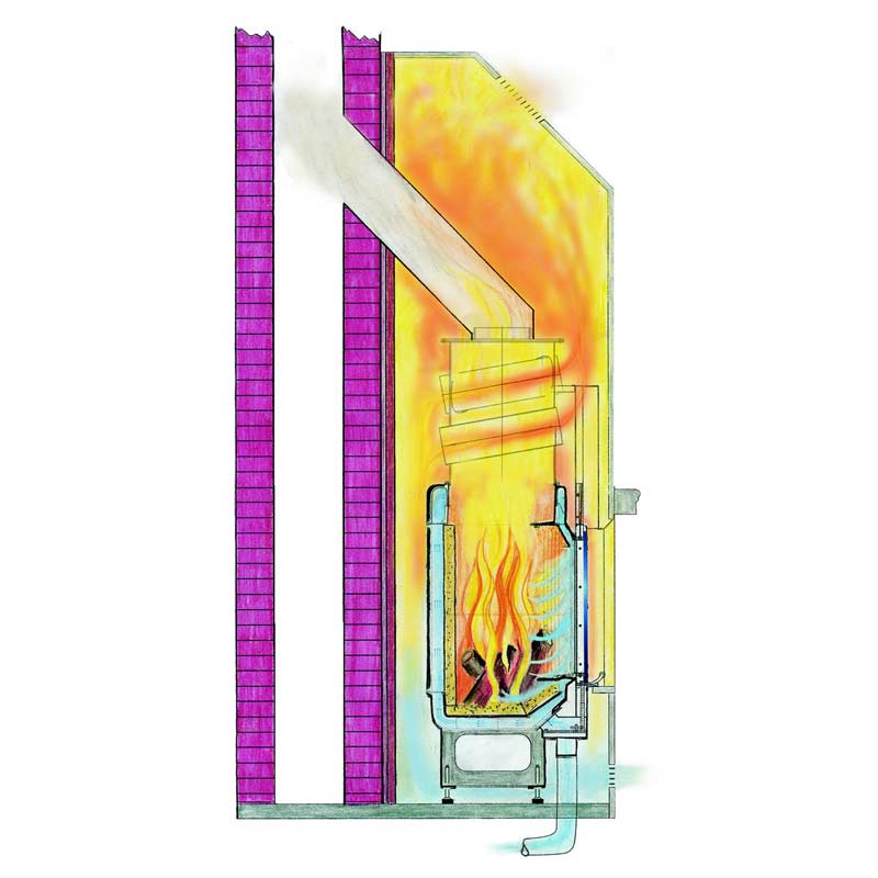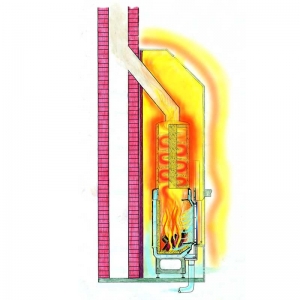 Die noch heißen Heizgase aus dem Feuerraum durchströmen eine Speichermasse, die direkt auf dem Feuerraum aufgesetzt ist. Diese Lösung ist ideal, wenn hoher Wirkungsgrad und eine Strahlungsofenlösung auf kleinster Grundfläche gewünscht wird. |