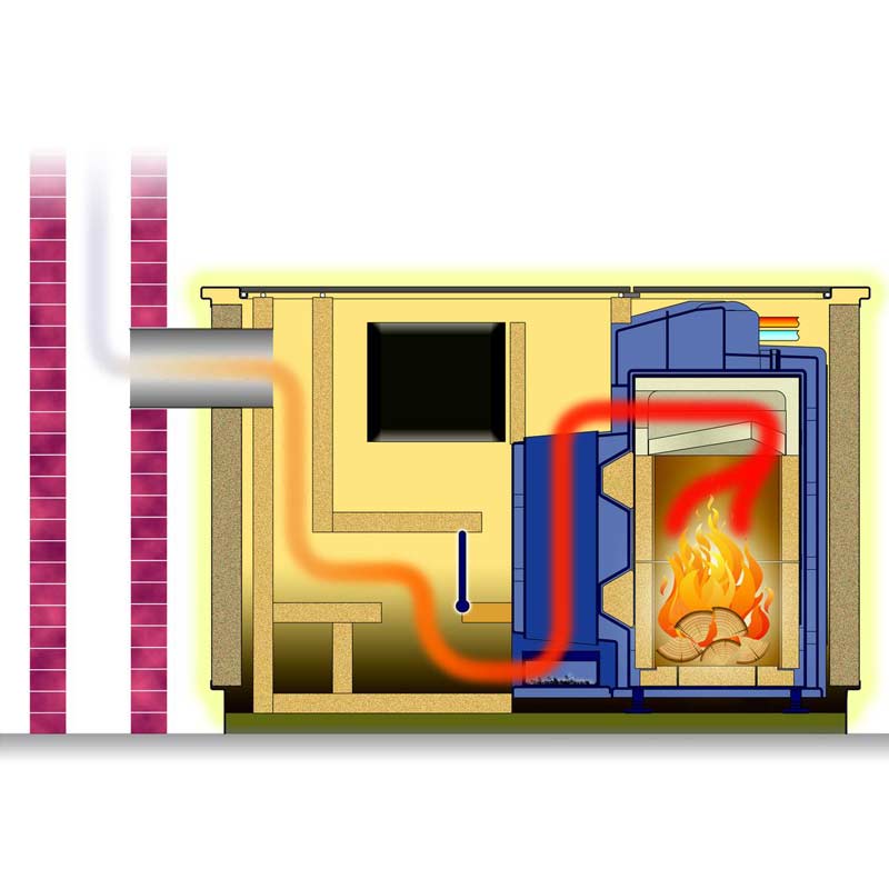 Die Heizgase strömen durch den seitlich integrierten, großen Heizgaswärmetauscher. Ein Überheizen des Wohnbereichs wird vermieden.